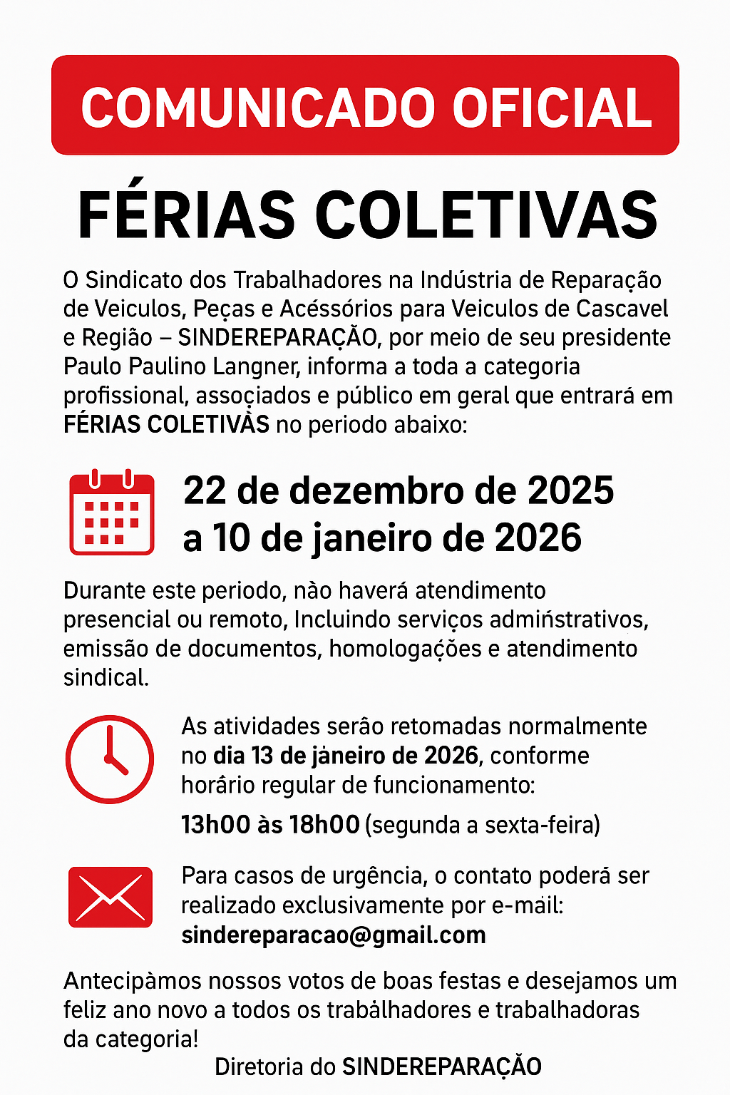 Nota de Repúdio O Sindereparação manifesta total repúdio aos atrasos salariais ocorridos em algumas empresas do setor automotivo da região. O sindicato está acompanhando os casos e orienta os trabalhadores a procurarem a entidade para registro formal e encaminhamento jurídico.